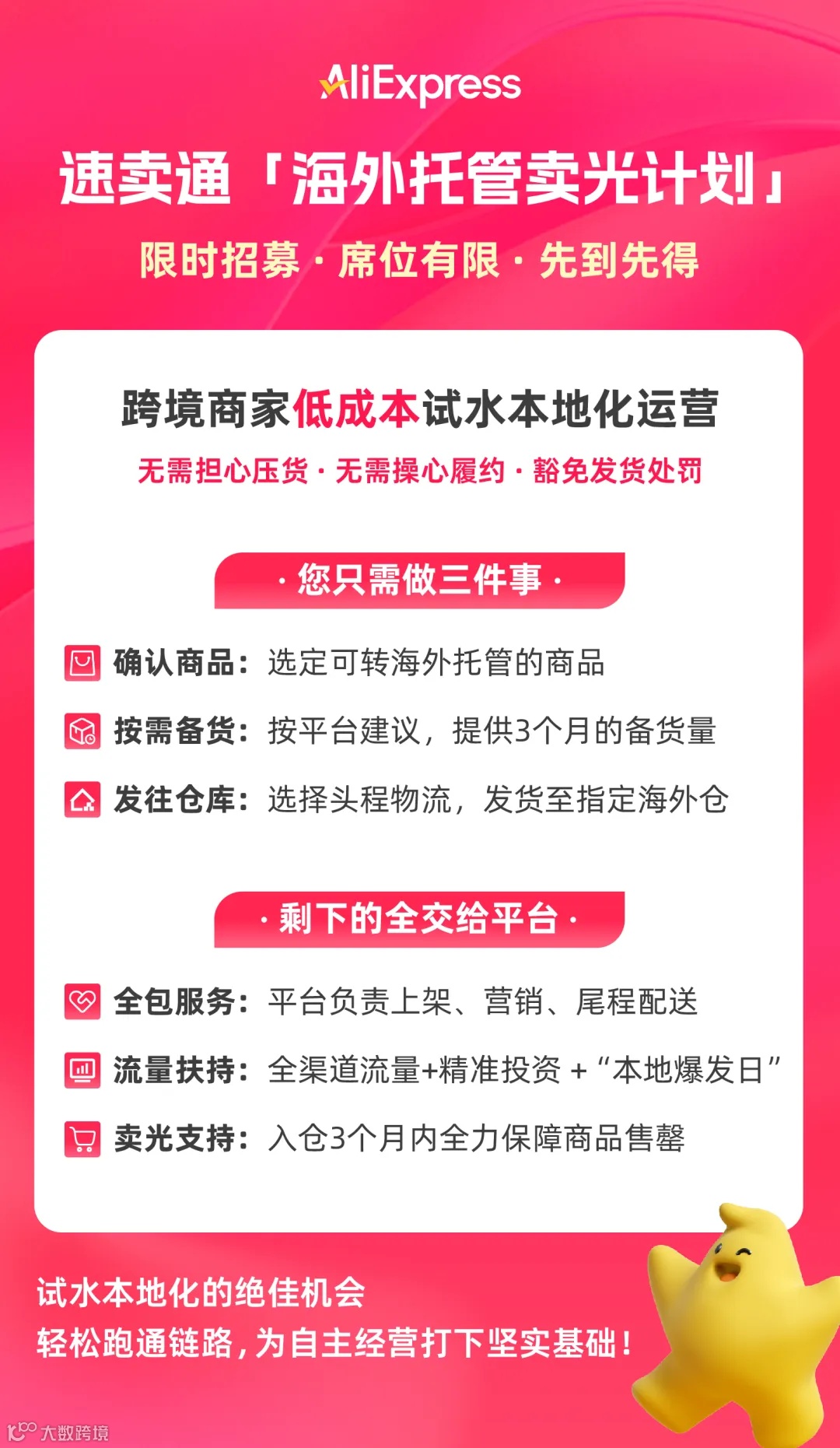 速卖通「海外托管卖光计划」现已开启限时招募,席位有限,先到先得。