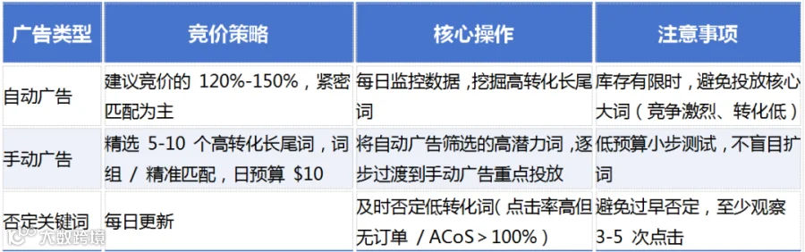 - 广告组:针对具体产品/关键词优化,高转化词提竞价,低转化词及时否定。