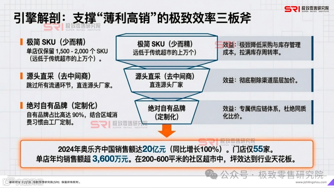 成效验证:奥乐齐2024年销售额20亿元,同比增长100%,单店年均销售额超3600万元。其"薄利高销"模式通过高坪效实现盈利,而非传统"薄利多销"逻辑。
