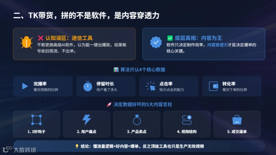 掌握流量逻辑后,使用基础工具即可制作高转化视频;缺乏内容功底,顶级AI仅产出无效内容。