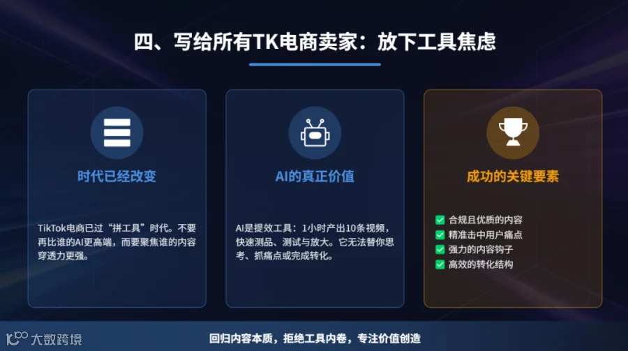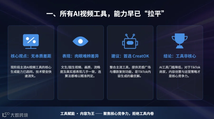 AI工具门槛快速降低,功能高度趋同。对TikTok商家而言,工具不再是核心竞争力。
