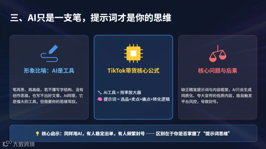 缺乏精准提示词与成熟内容框架,再强大的AI也易生成同质化内容,引发风控风险。这解释了为何相同工具下,有人稳定出单而有人频繁封号。