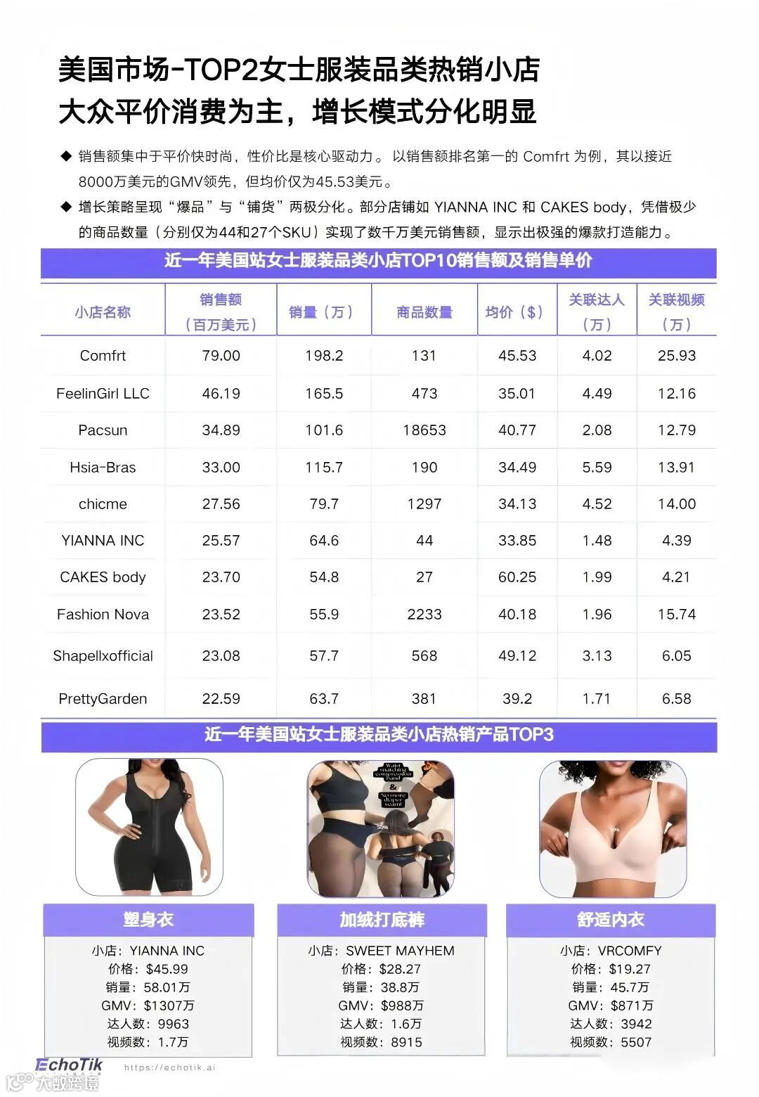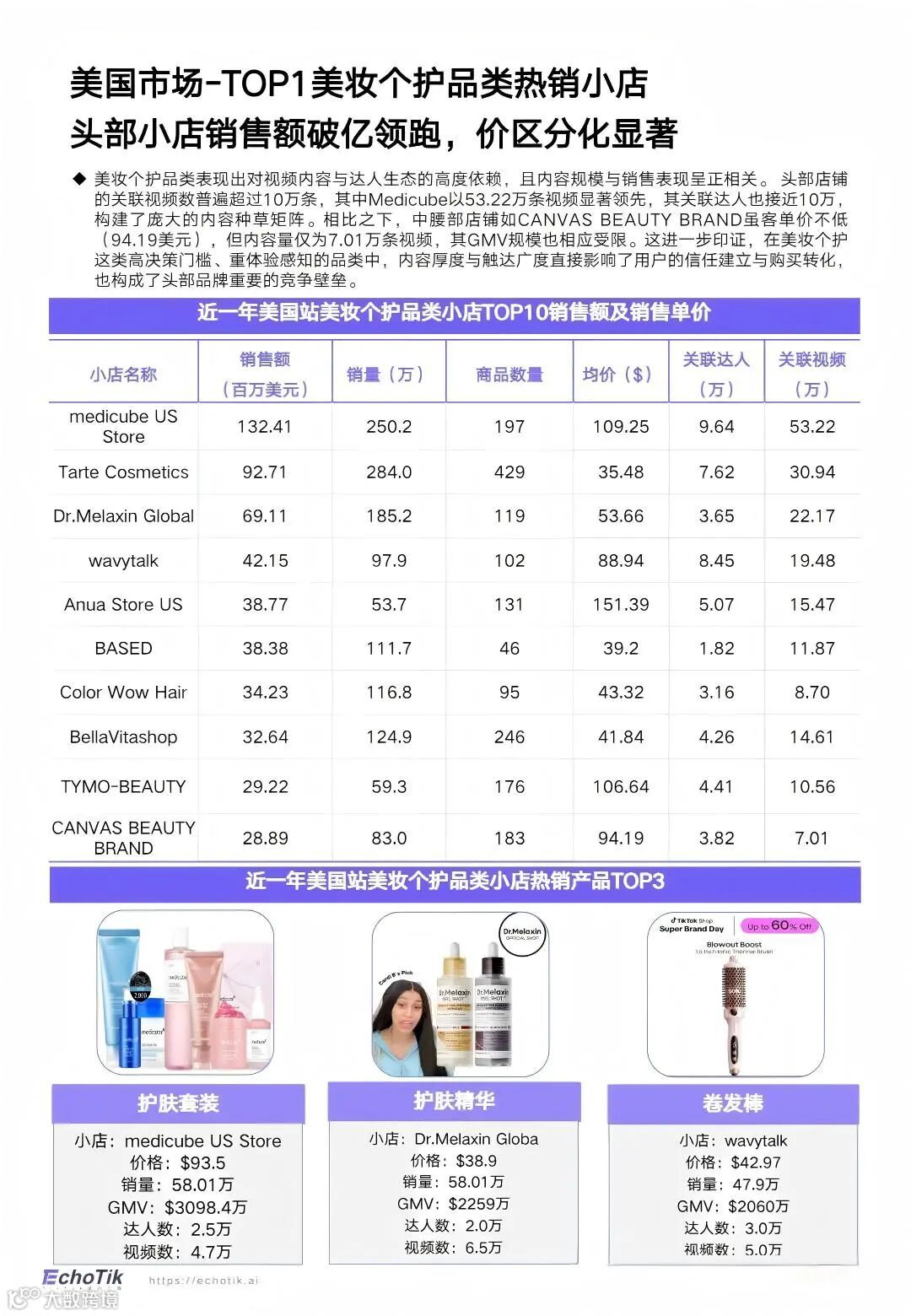 先说明一下,下面提到的 TOP3,主要参考 EchoTik 平台美国站 TikTok 电商监测数据 。EchoTik 官方把自己定义为 TikTok analytics tool / TikTok 电商数据分析平台 ,其产品能力包括商品、店铺、达人、直播和销售排名等分析,因此这组数据反映的是 美国站 TikTok 电商维度的线上表现 ,不是美国整体线下零售排名。