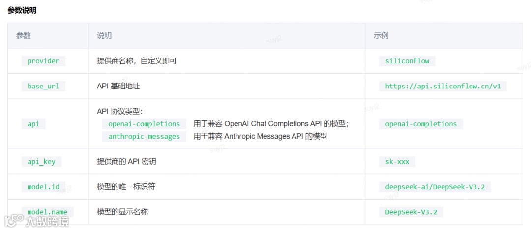 硅基流动示例(OpenAI协议):{"provider": "siliconflow","base_url": "https://api.siliconflow.cn/v1","api": "openai-completions","api_key": "your-api-key-here","model": {"id": "deepseek-ai/DeepSeek-V3.2","name": "DeepSeek-V3.2"}}