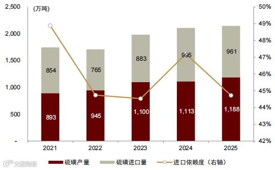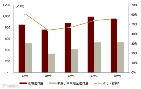 硫磺进口依赖度45%,其中56%来自中东,近期价格快速上涨压缩磷肥利润空间。我国磷肥以净出口为主,短期国内供应有保障,但成本传导不畅。出口配额充足企业有望在海外价格高企时提升盈利。