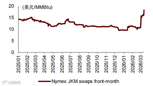 卡塔尔LNG出口占全球20%,其停产及霍尔木兹海峡封锁已推动JKM现货价格较冲突前上涨超70%。目前期货曲线隐含市场预期供应影响约1个月,若停产持续超2个月,将影响全球年度供应3-4%,叠加欧盟低库存及夏季用气旺季来临,价格可能冲高至30美元/MMBtu以上。