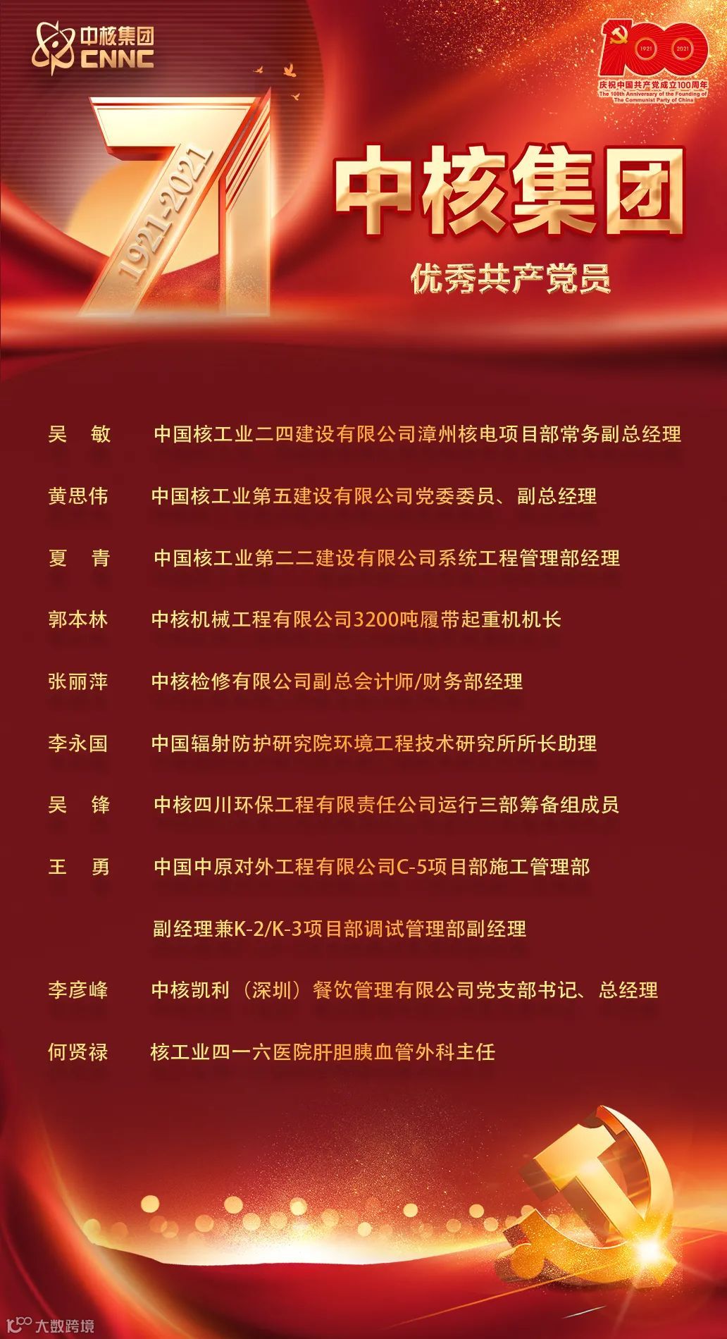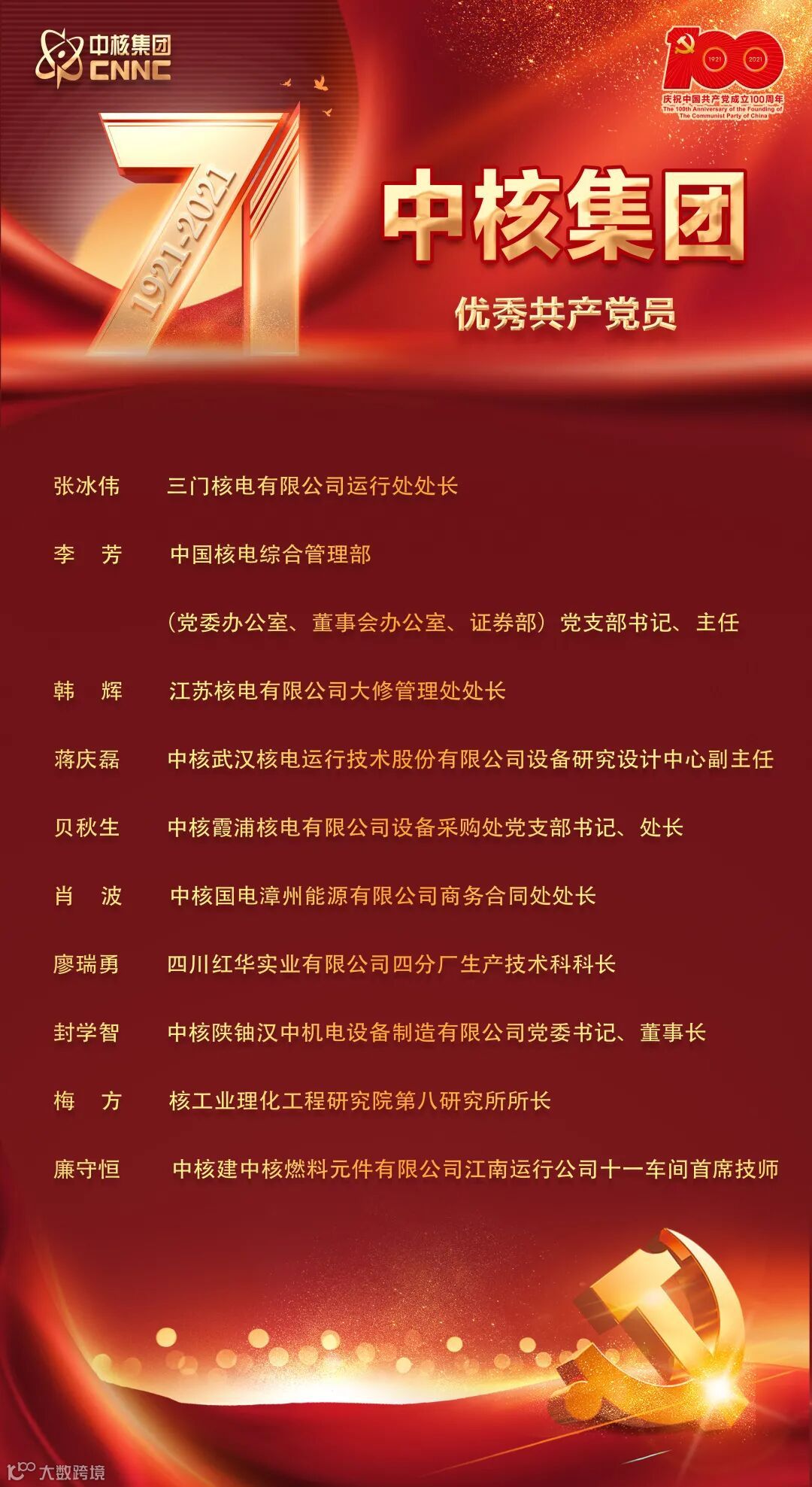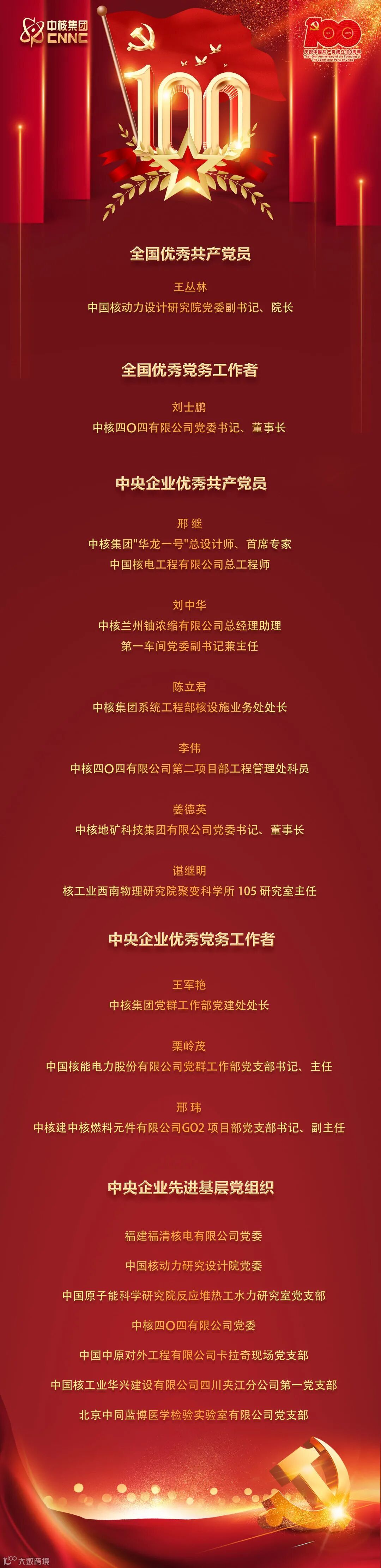 7月2日,中核集团在总部召开庆祝中国共产党成立100周年大会,在大会上对中核集团优秀共产党员、优秀党务工作者以及先进基层党组织进行了表彰。表彰名单如下: