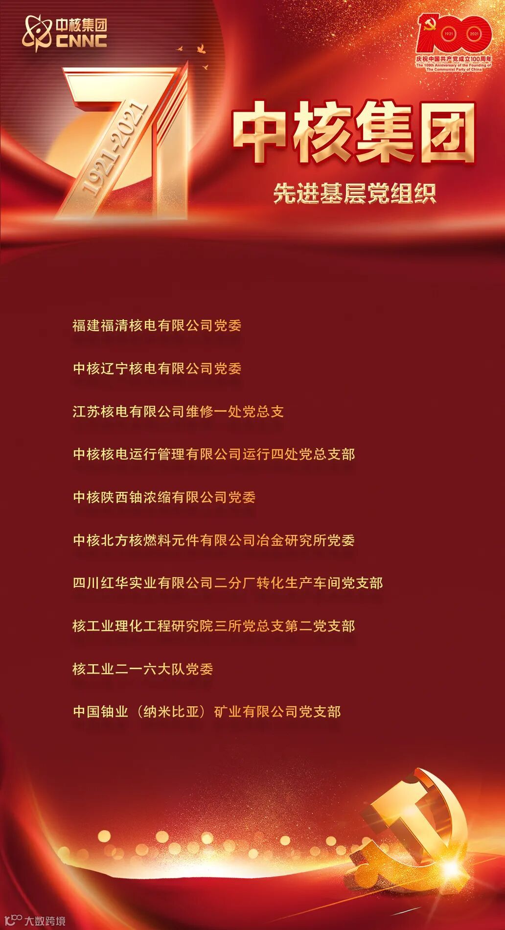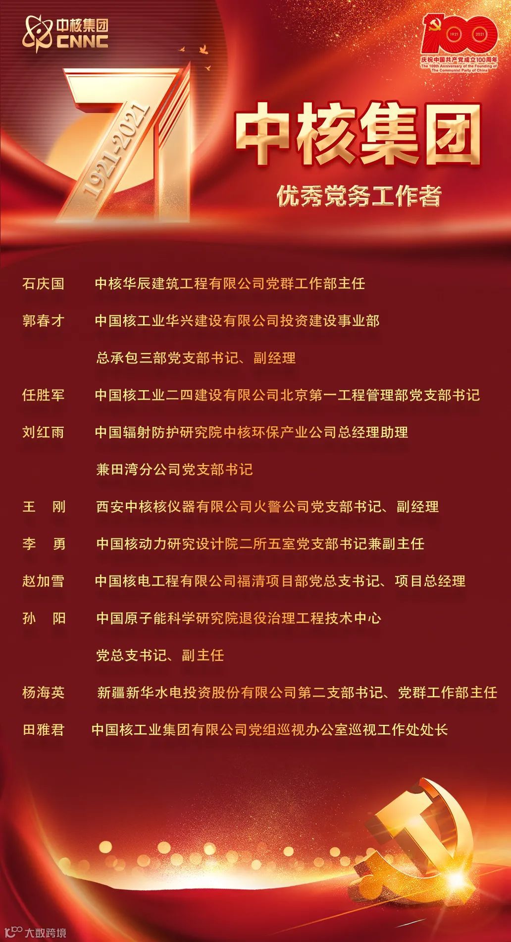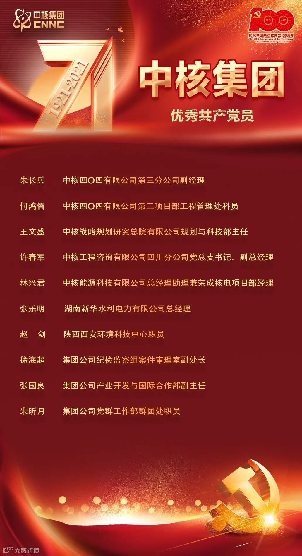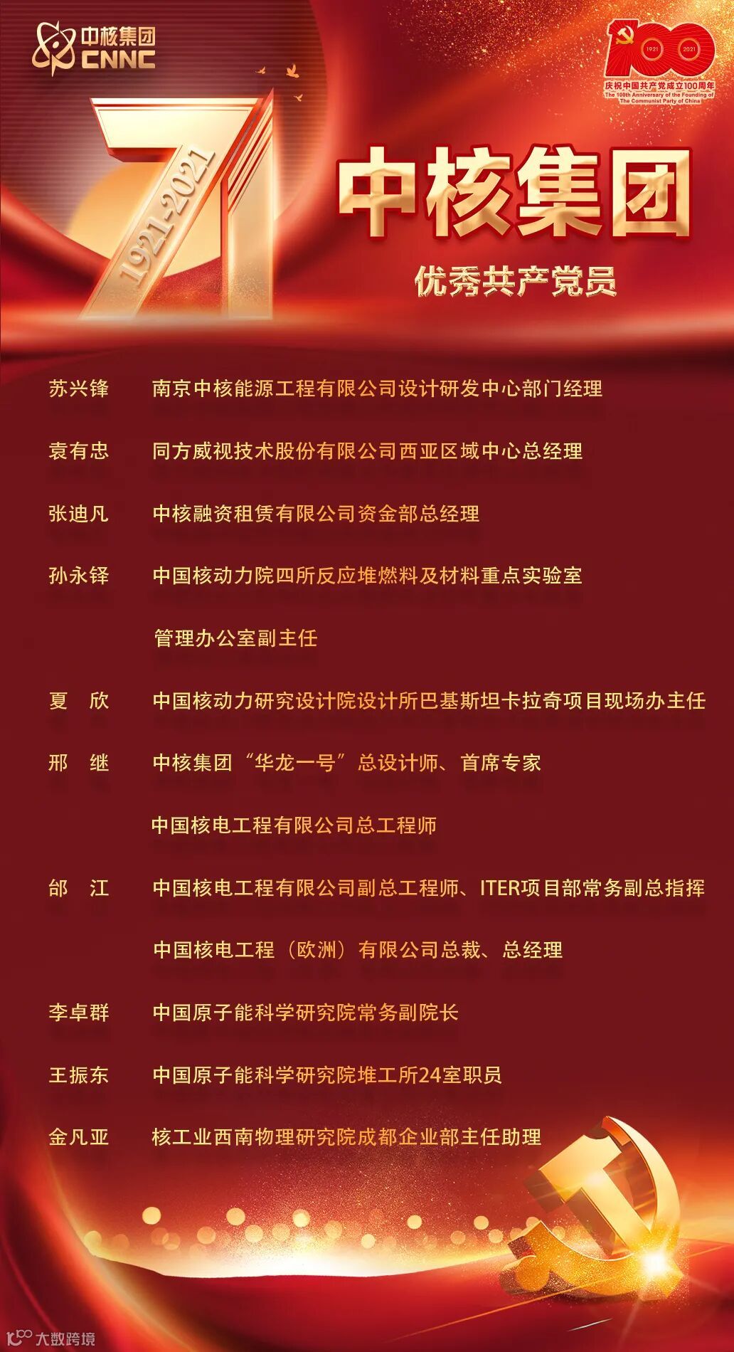 7月2日,中核集团在总部召开庆祝中国共产党成立100周年大会,在大会上对中核集团优秀共产党员、优秀党务工作者以及先进基层党组织进行了表彰。表彰名单如下: