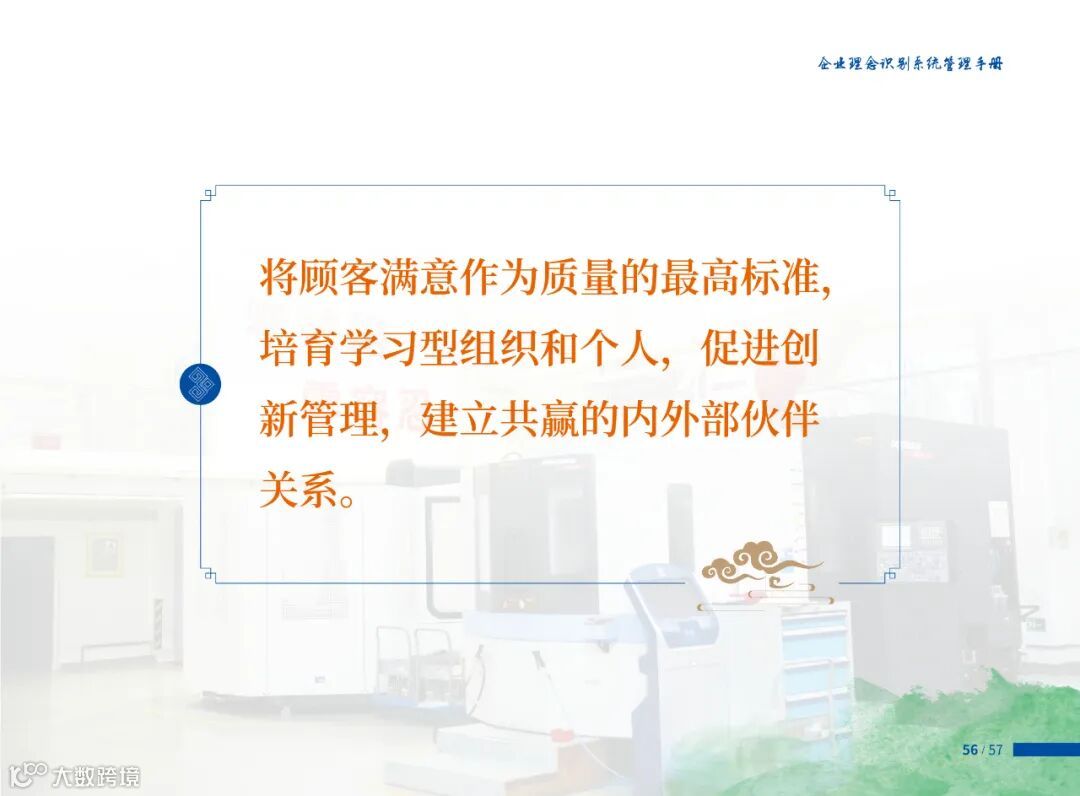 将顾客满意作为质量的最高标准,培育学习型组织和个人,促进创新管理,建立共赢的内外部伙伴关系。