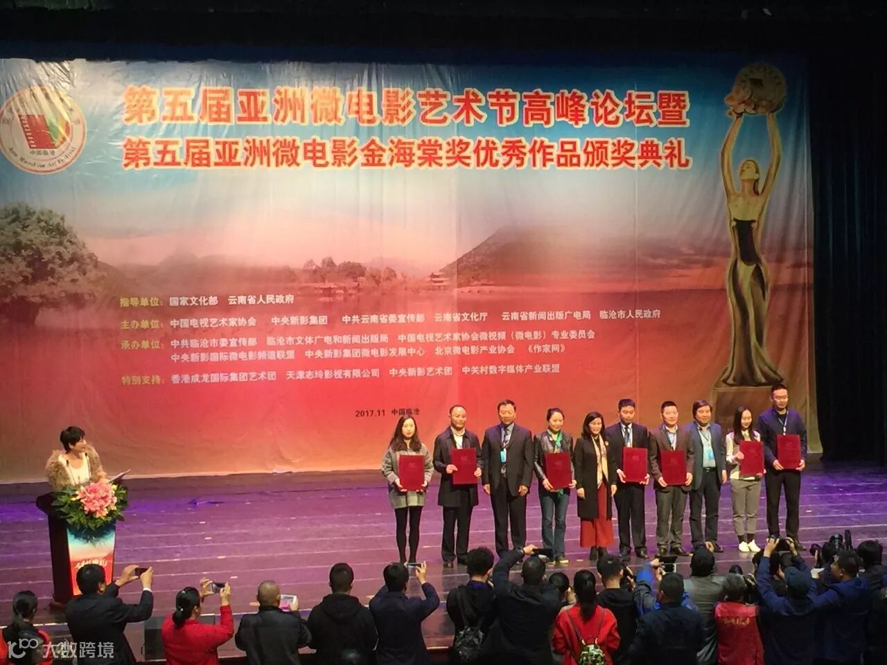 11月6日至9日,第五届亚洲微电影艺术节在云南省临沧市隆重举行。7日晚,国内外诸多影视艺术家、知名演员、获奖作品代表参加了亚洲微电影节“金海棠奖”的颁奖晚会,晚会由著名导演李春来担任总导演,央视著名主持人于胜春、周宇等主持,并在云南卫视等多家电视台现场直播,人民日报海外版、新华社、光明日报、经济日报、中国日报等诸多国内外媒体全程报道。我公司拍摄的微电影《走进大山的核宝》在数千部参赛作品中脱颖而出,荣获“第五届亚洲微电影艺术节金海棠奖——大国工匠单元优秀微电影奖”。中核建中派代表参加了本届艺术节,并出席了颁奖典礼、高峰论坛等系列活动。