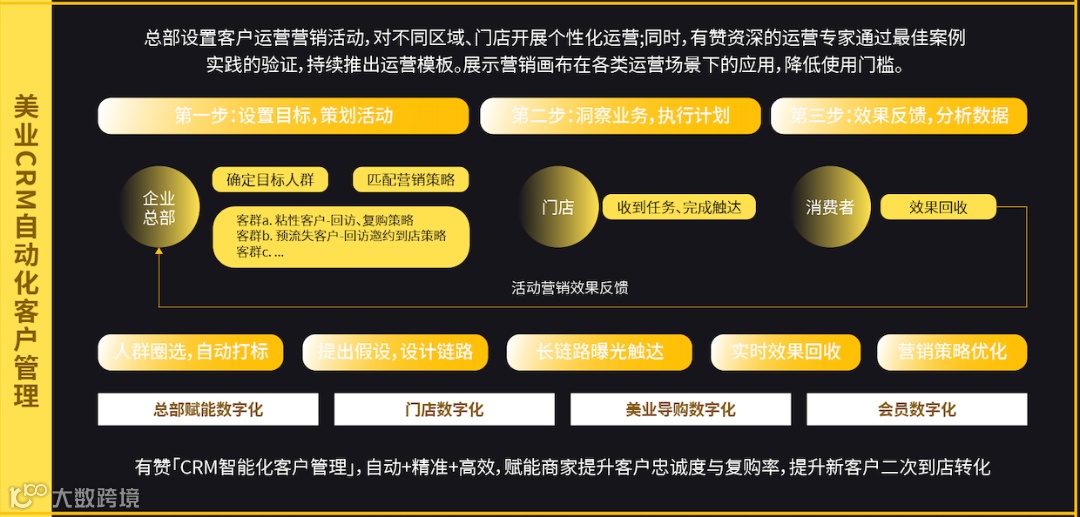有赞美业.CRM(大脑):可以基于全渠道的客户数据沉淀,提供全方位精准的数据洞察和客户画像,匹配丰富的营销手段,一键派发营销任务到导购助手,帮您实现千人千面精准营销。 -