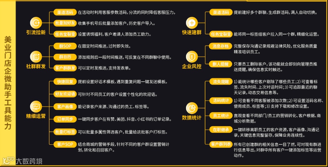美业门店企微助手工具能力:从引流拉新、快速建群、社群群发、精细运营、企业风控、数据统计等6大版块助力商家私域运营效率效果双提升。