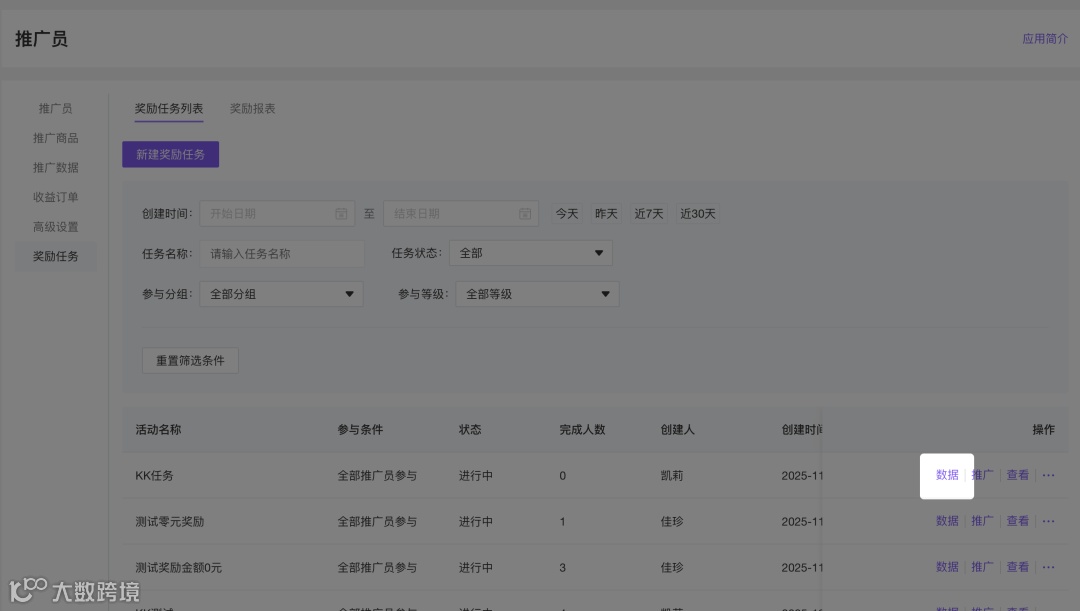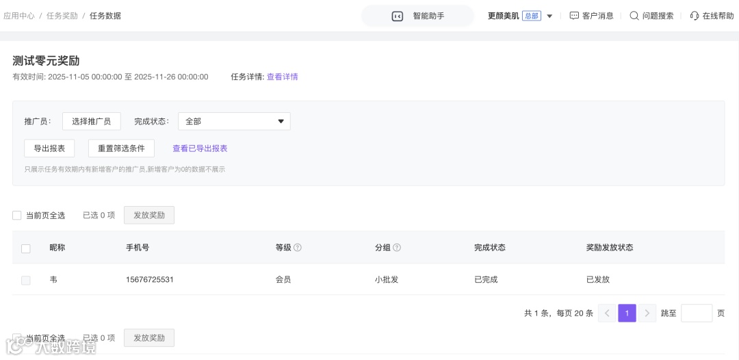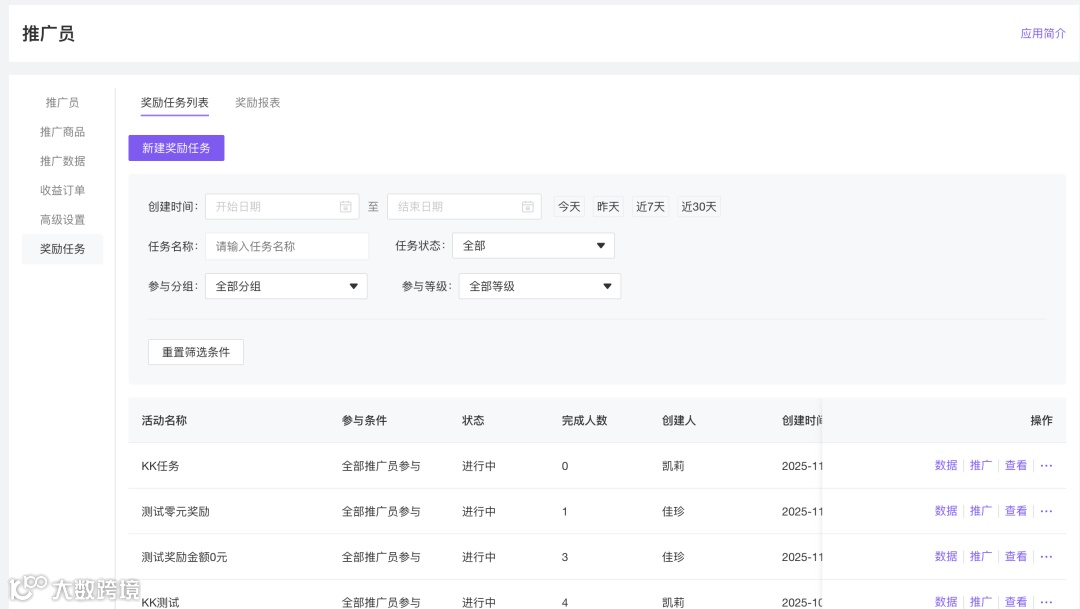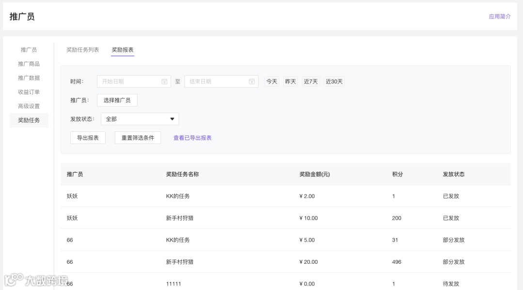 奖励报表:展示推广员在某个任务下获得的奖励以及发放情况。