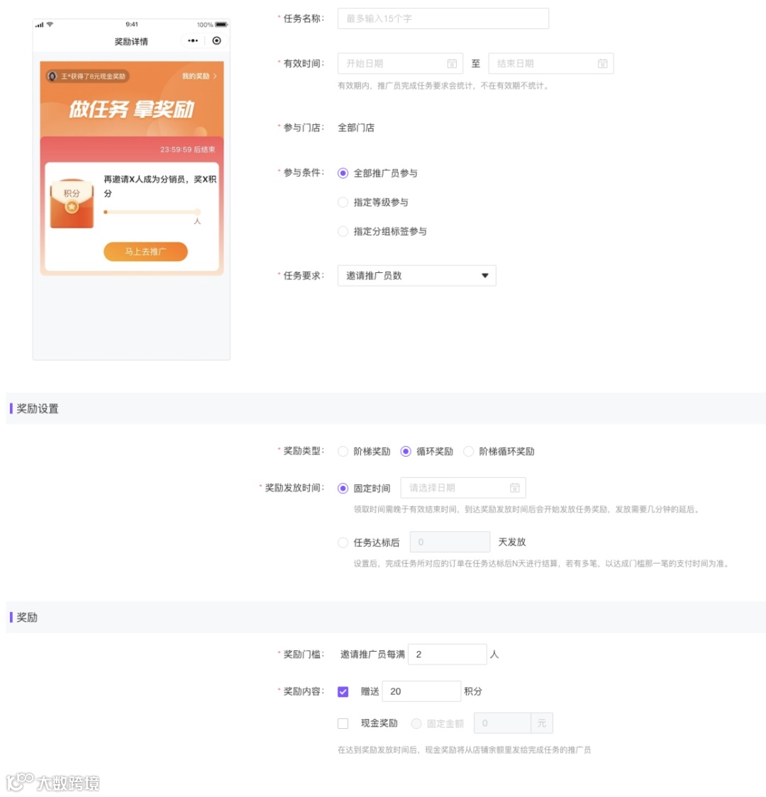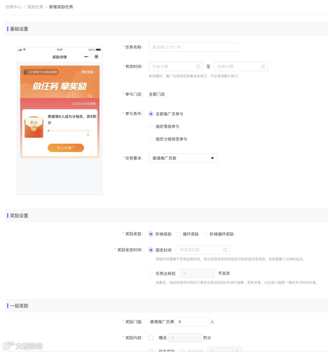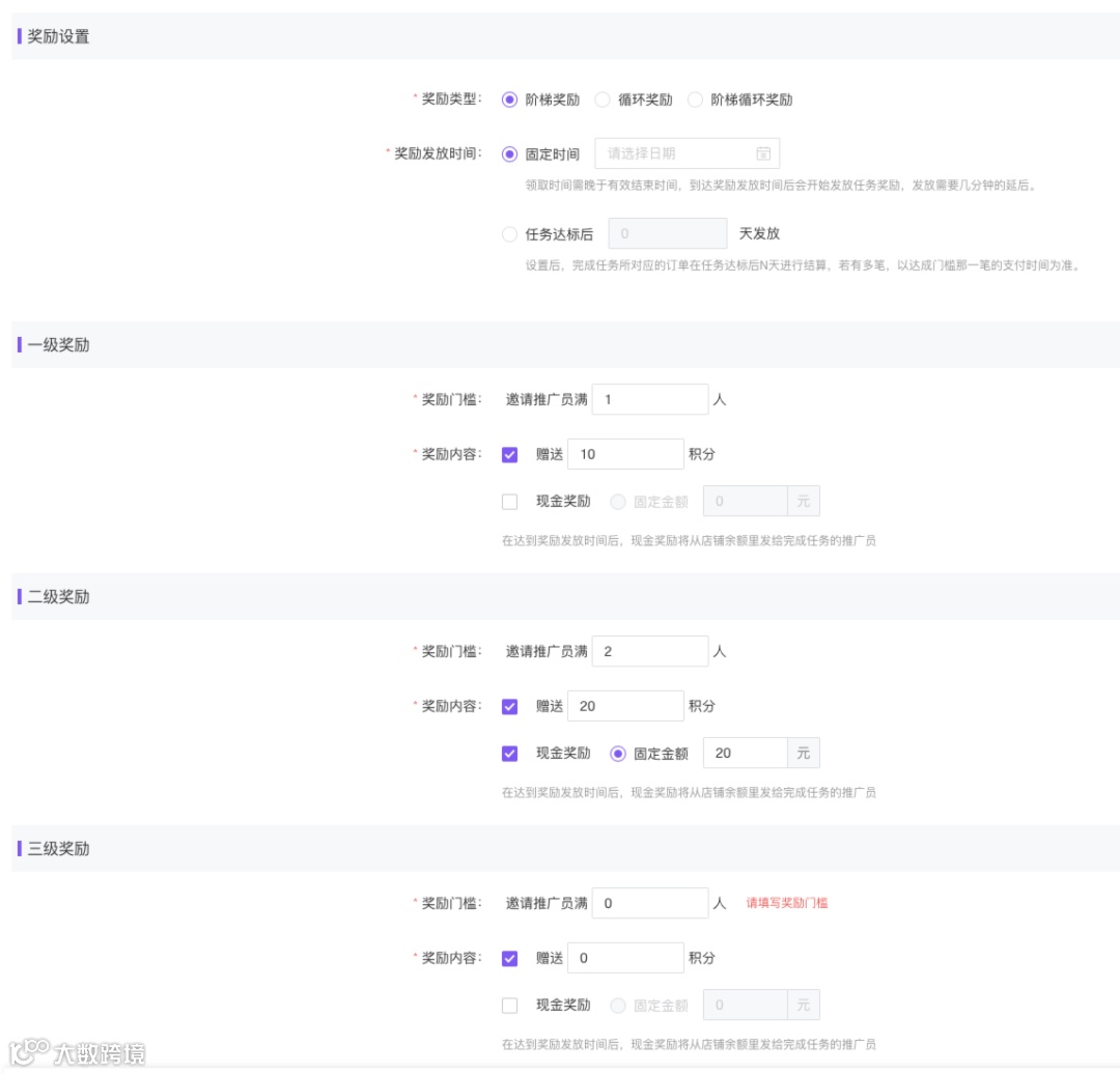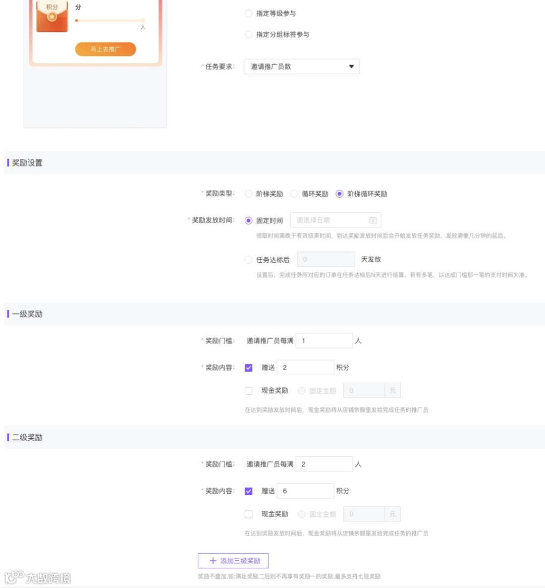 阶梯奖励:符合奖励门槛时,将按照奖励内容进行积分/现金发放;若配置了3个阶梯,当推广员达到3级阶梯后,再有更多的邀请下级数也不再重复发放奖励;阶梯上限为8阶。