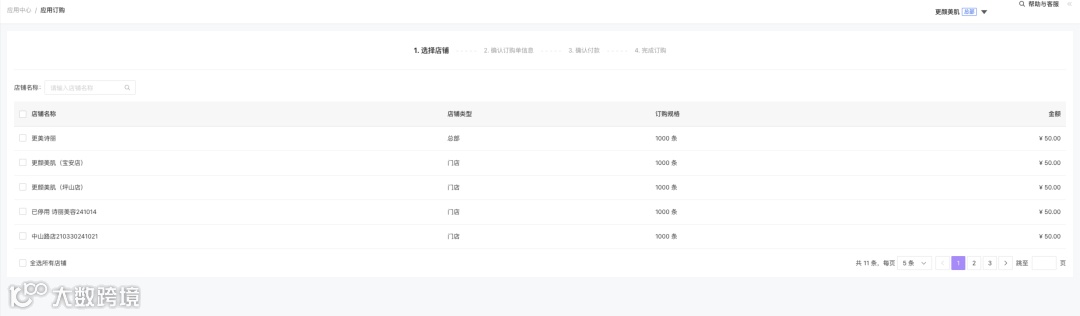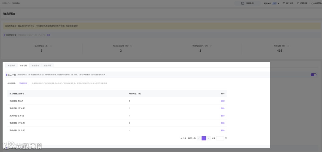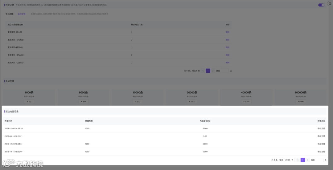 短信订购下方新增参与独立计费的门店模块,开启独立计费后,可选择需要自己承担短信消耗费用。