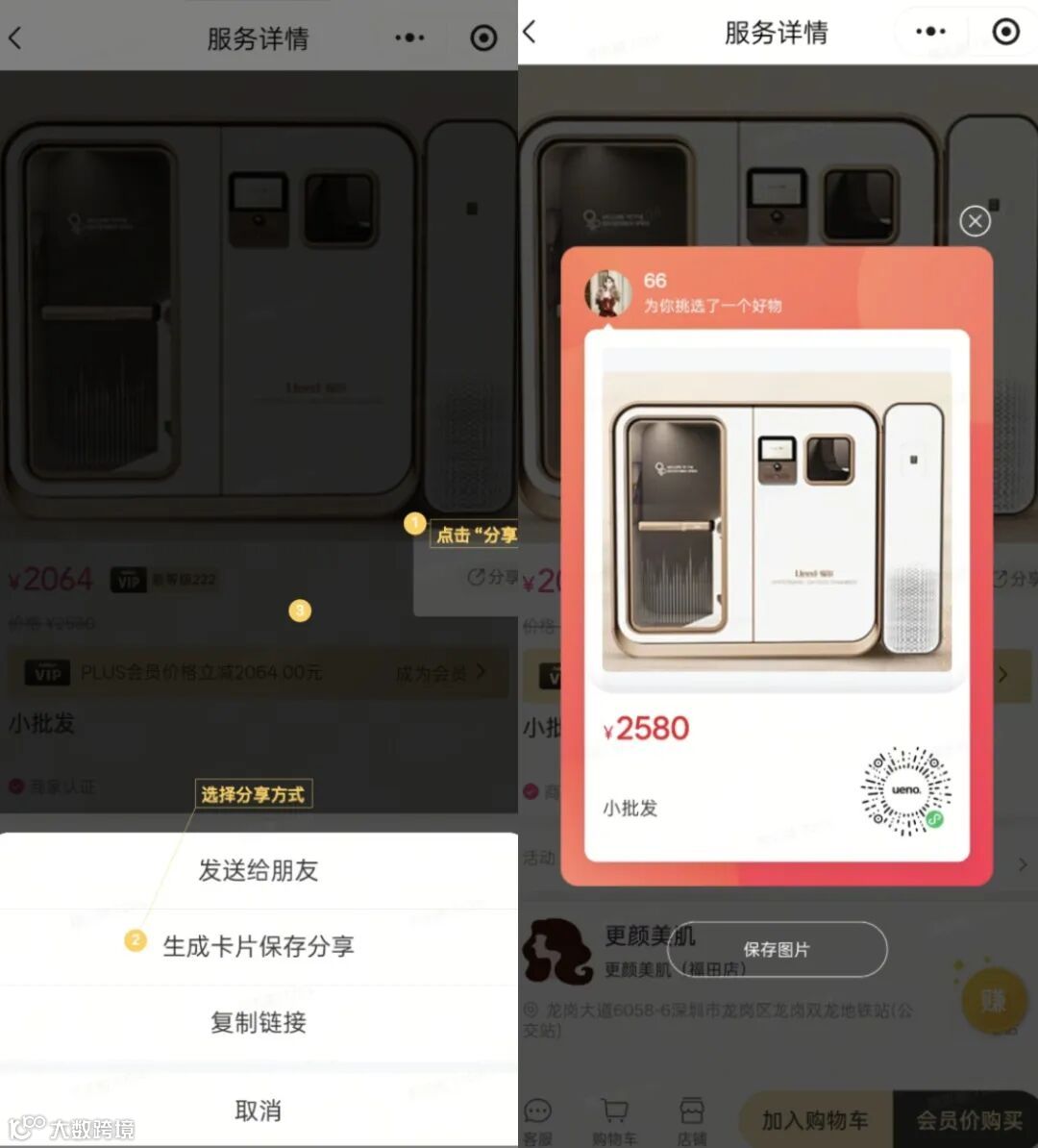 推广员A可以在具体商品详情页中(如下左图),通过点击“分享”把商品链接或者海报发给非推广员用户(如下右图)。