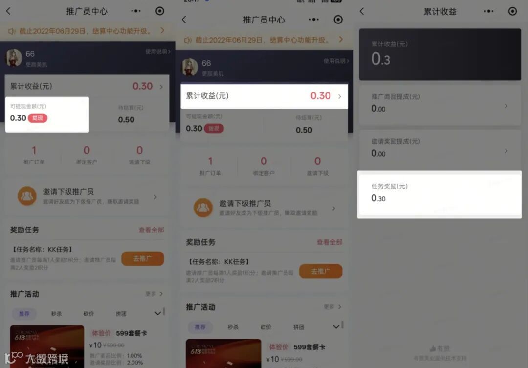 奖励任务现金提现步骤:推广员中心-可提现金额“提现”;可通过点击“累积收益”查看来自奖励任务的收益。