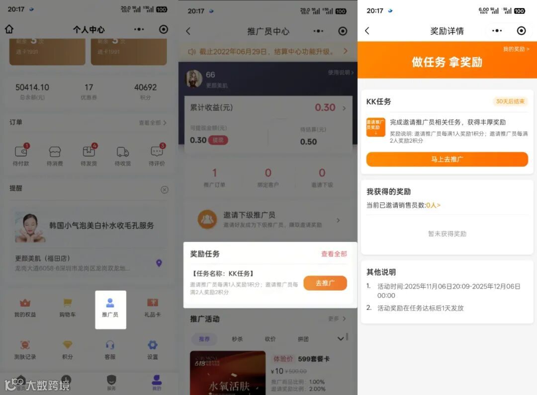 在推广员主页中可以看到当前用户可参与的“奖励任务”(如上中图);在奖励任务卡片内,点击“去推广”则跳转至具体的任务内容;若点击奖励任务卡片区域,则跳转至具体的任务详情页(如上右图);点击“查看全部”,则可查看全部当前推广员可参与的奖励任务。