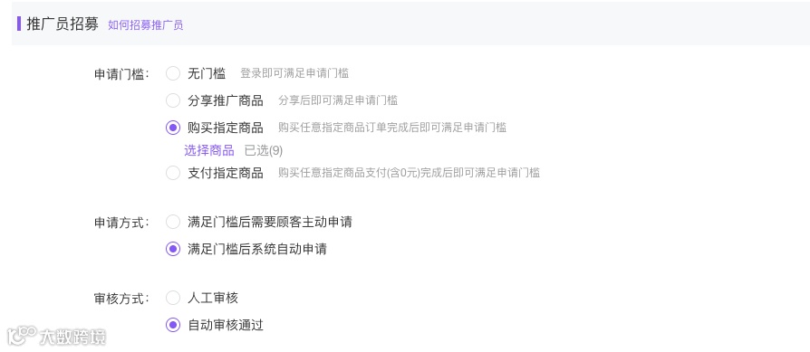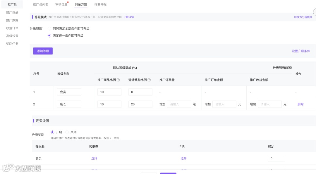 当推广员为等级模式时,可开启升级奖励,即:当推广员从等级1升级到等级2时,可设置升级奖励:优惠券、卡项、积分。