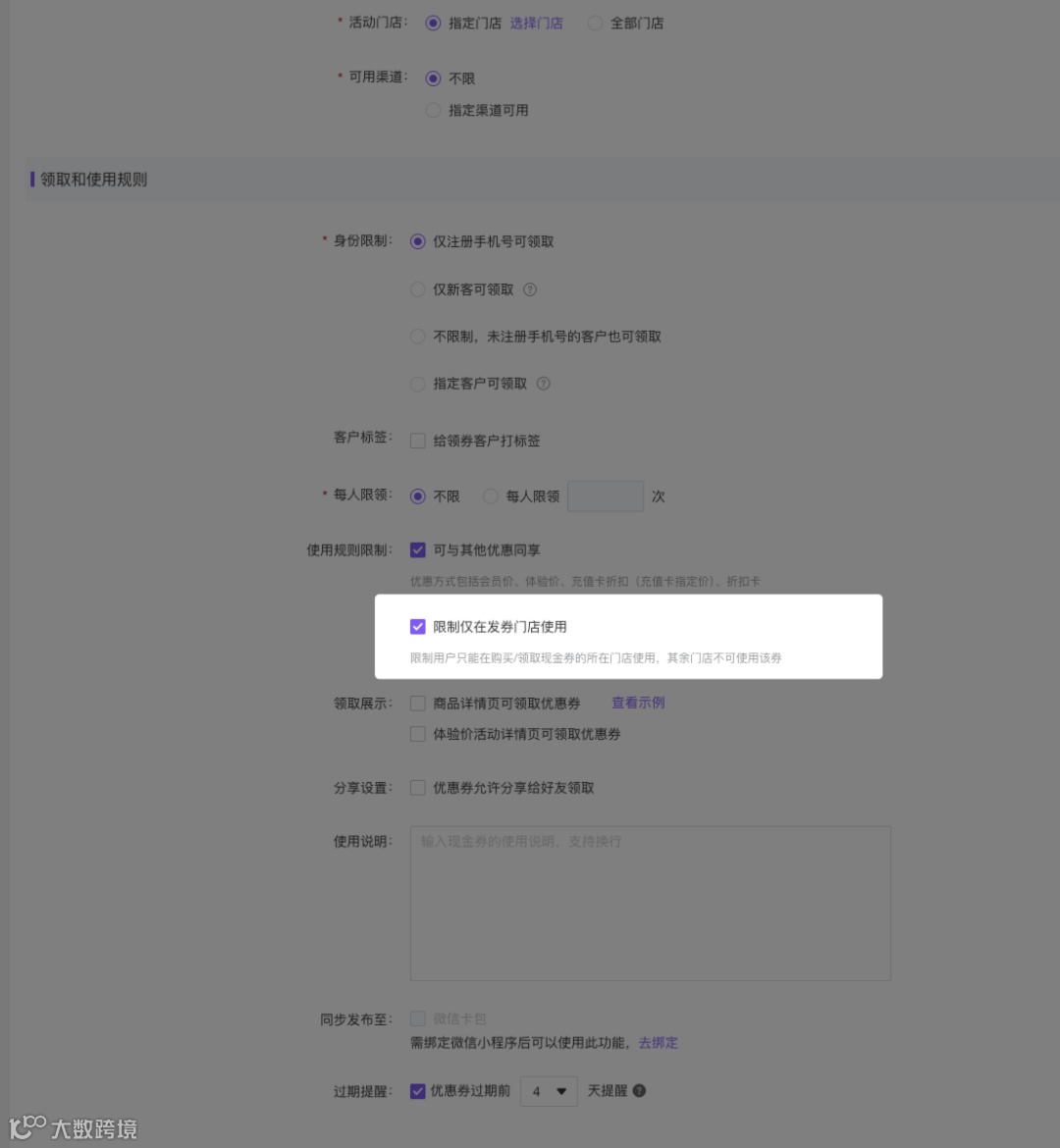 需求背景:加盟模式的商家想做促销活动时,希望能发放现金券吸引新客户维护老客户,同时由于加盟模式门店自负盈亏,不希望影响其他门店。因为,希望客户从A店领取了现金券,只能在A店使用。