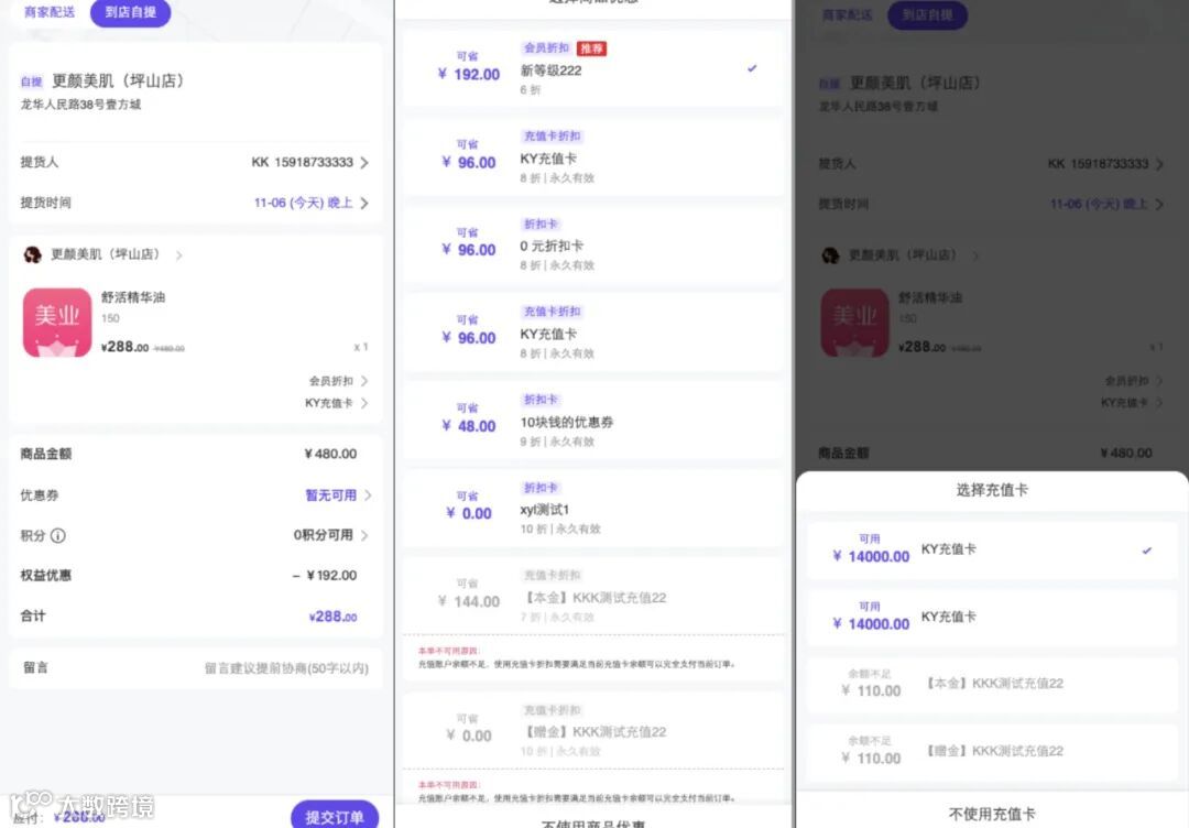 操作路径:下单时,可以选择会员权益且消耗充值卡账户。