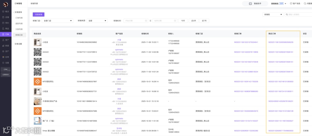 每一条核销记录都显示关联的购买订单,点击可跳转至订单详情查看。