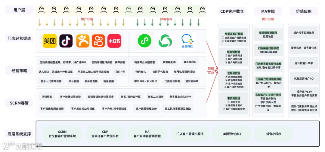 门店客户数字化经营管理的前提是CDP数仓完成公域和私域客户消费信息及标签收集,总部借助MA完成客户旅程设计,SCRM完成策略下发至门店端,实现客户管理和运营。