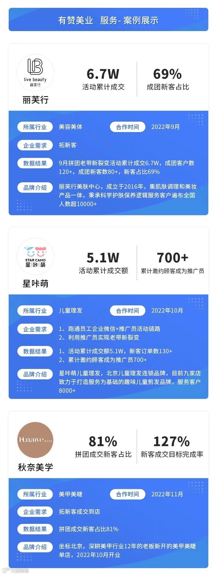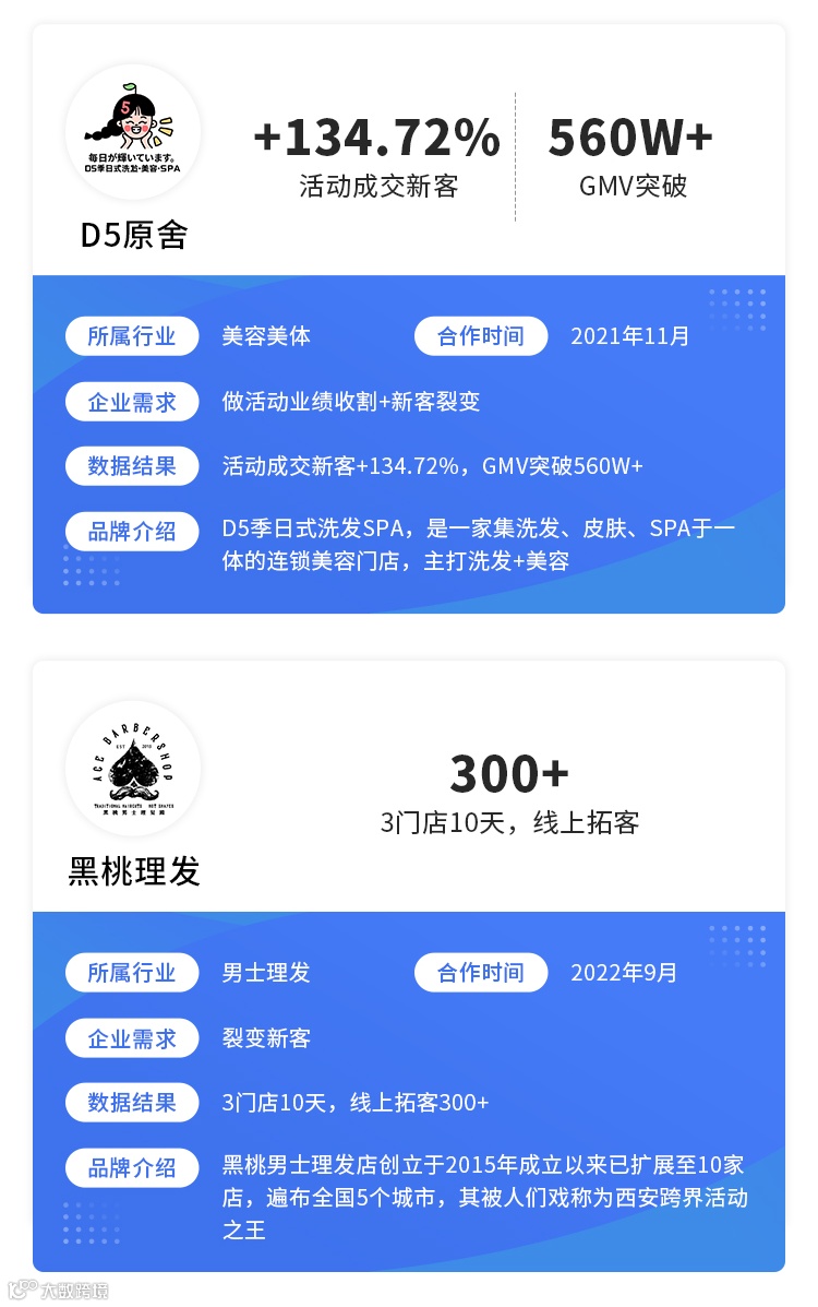 目前已经成功赋能潘多拉Hairsalon、D5原舍、丽芙行、星咔萌等行业标杆商家完成营销活动落地,实现活动销售成交&新客转化等目标,最高活动销售额达750w+!
