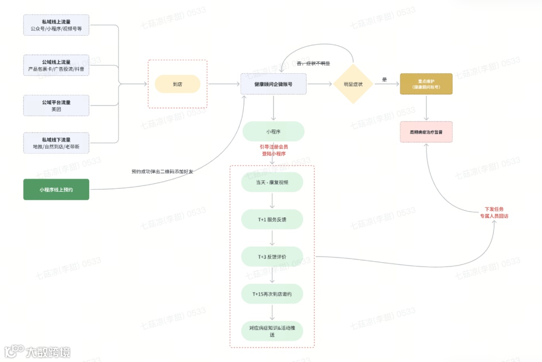 门店推拿师专注于为到店客户提供专业理疗服务,总部私域运营团队设立“健康顾问”角色直接管理顾客,负责离店后的客户跟进服务,门店医生负责顾客到店之后的诊断,形成从入店到离店、再到售后的无缝衔接服务体系。