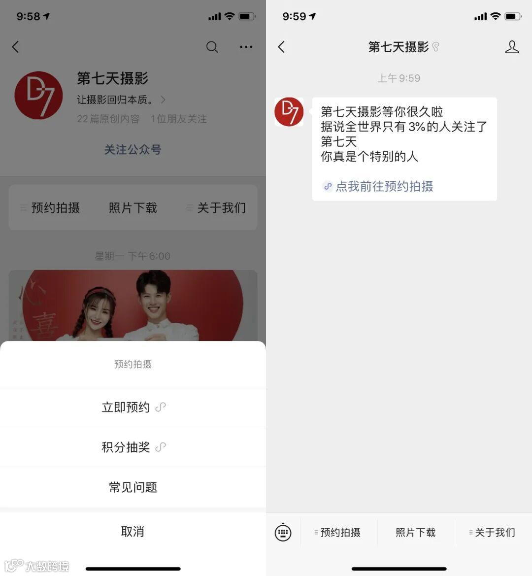 ①在微信公众号入口配置微信小程序。第七天摄影在公众号的菜单栏、关注公众号自动回复等入口都配置了店铺专属小程序。
