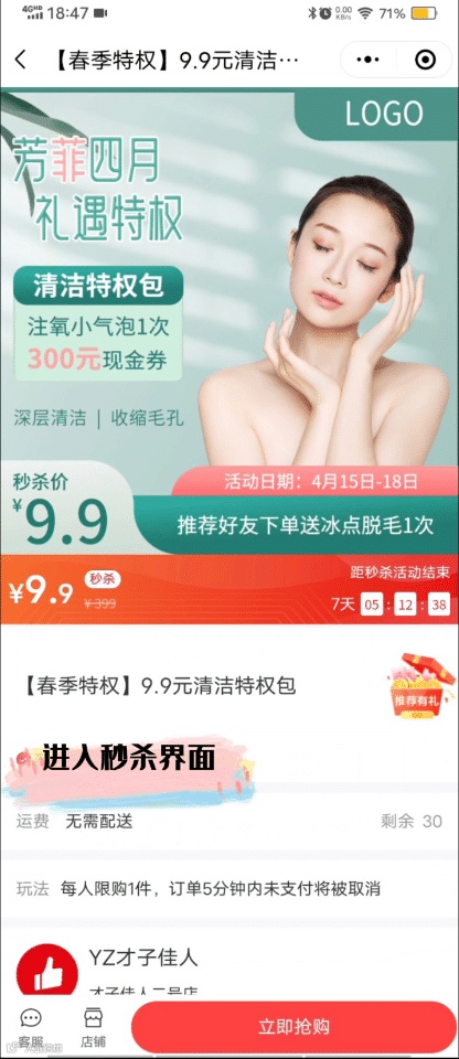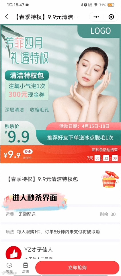 有赞美业超级活动营本期主题「芳菲四月 礼遇特权」将迎合当下顾客迫切变美的诉求,结合秒杀+支付有礼+推荐有礼等玩法,以激活、裂变、升单为目的进行活动营销。