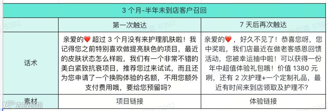 根据客户离店的时间,3个月到半年内未到店的客户可以通过活动、抽奖等福利的触达,先引起客户的注意,再邀约到店体验进行升单。