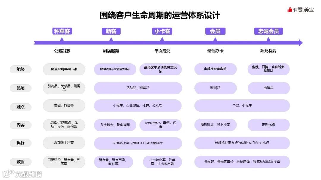 基于种草客、新客、小卡客、会员、忠诚会员等不用客户阶段,去设计不同的策略、品项、触点、内容等,通过执行和数据分析不断进行迭代优化,从而提升客户的全生命周期价值。