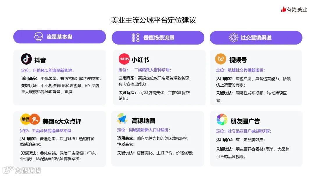 具体该怎么做呢?孙硕老师分享了有赞美业总结的各大公域平台定位、适用商家和关键玩法。