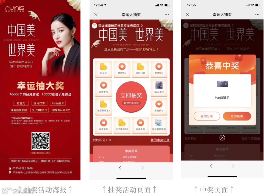 目前比较流行的“100%中奖"的抽奖机制的玩法。这种玩法,用户的参与普遍都比较高,它能有效降低参与用户对沉没成本损失的担忧心理。会让用户觉得参与了活动,如果抽不中大奖,也有保底的奖品可以抚慰,万一幸运抽中了大奖,那就是血赚。