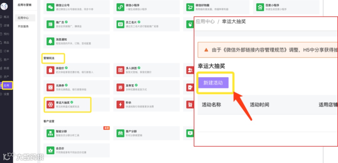 通过【应用】-【幸运大抽奖】进入点击【新建活动】,再根据营销活动方案来设置内容