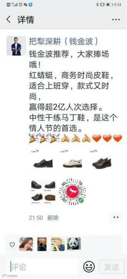 红蜻蜓董事长钱金波在 4000 家门店停业的情况下,带头在朋友圈卖鞋,按下红蜻蜓全员营销按钮。2 月 14 日~17 日,连续四天,红蜻蜓小程序日销售额均突破一百万。