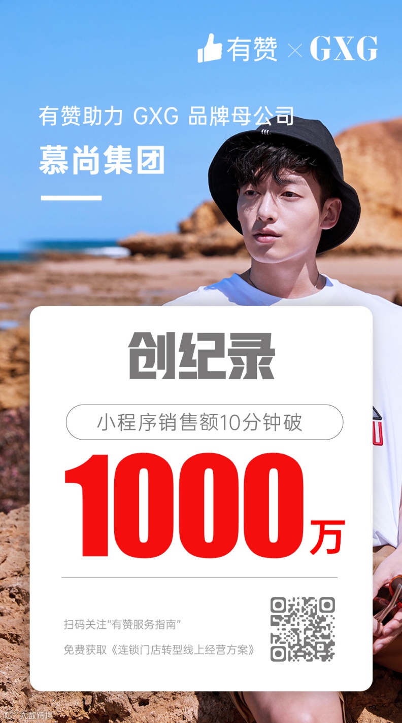 疫情期间有赞商家的线上交易有多猛?国民服装品牌 GXG 是一个典型的代表。在今年 3 月份的一次活动中,GXG 的小程序销售额在 10 分钟内就突破了 1000 万。