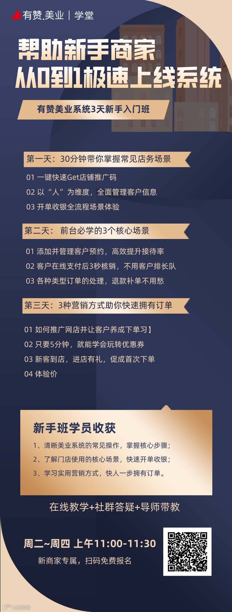 想知道如何快速上线系统促成单么?有赞美业「3天新手入门班」,通过直播授课的形式,帮您快速掌握有赞美业店务系统、营销工具等。