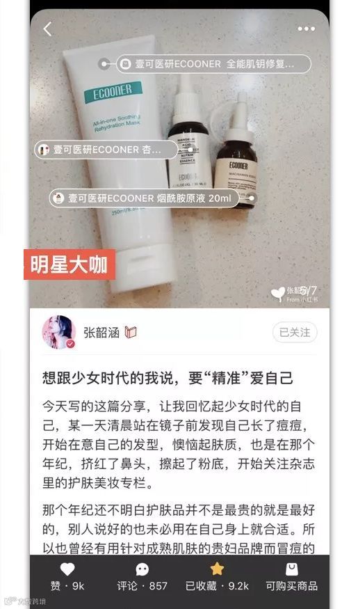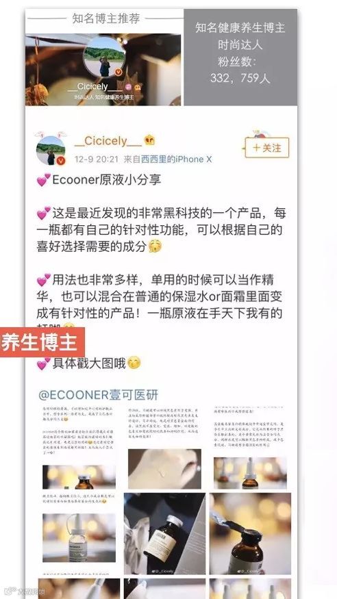 ① 「壹可医研」的客群大部分是一二线城市 20~30 岁年轻女性,她们偏好日韩药妆等专业护肤产品,更倾向于在购买前通过网上推荐的方式,详细了解产品成分、功效、口碑。运营团队通过分析这些特征,在微博、小红书、公众号上寻找适合投放的 KOL,比如产后孕妈、当地美妆博主等;