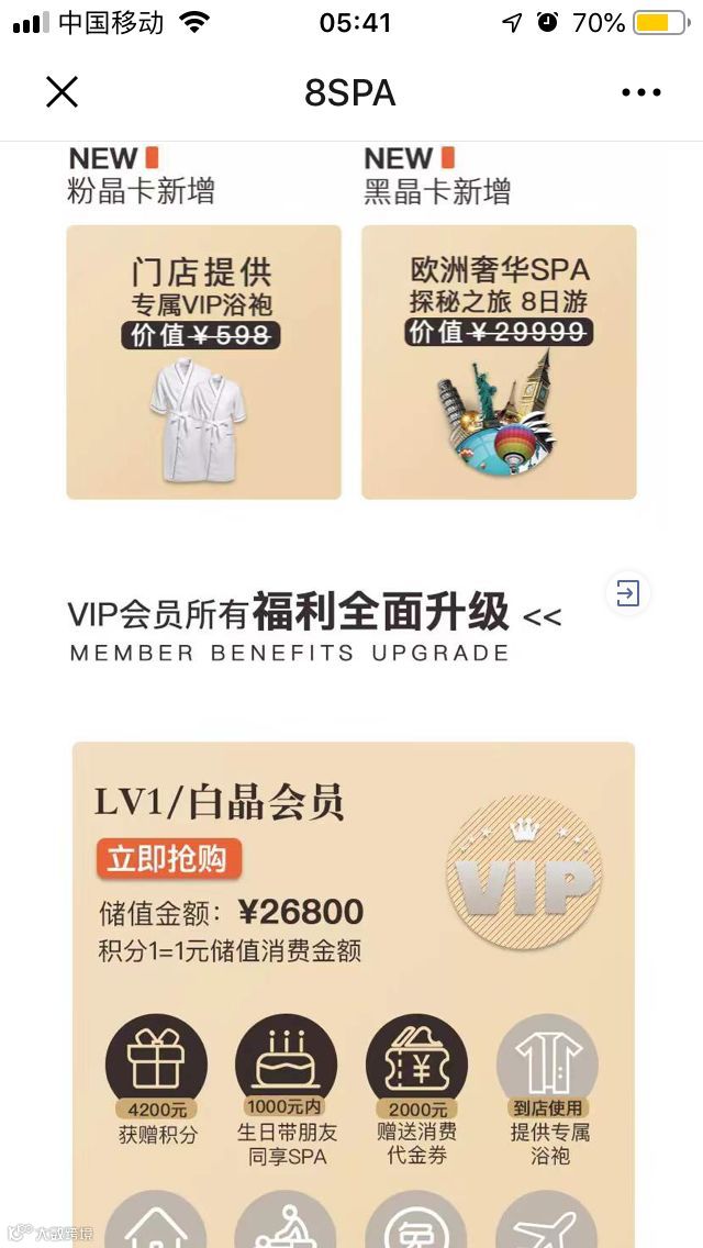 ② 新增高额充值卡,配合发放高价值的会员特权,大大提高老客的客单价。如:LV1 的白金会员卡,储值 26800 元,即可享受包括 4200 积分、2000 元代金券、房间预约优先权、新项目免费体验和欧洲奢华 SPA 探秘之旅 8 日游等八大特权。