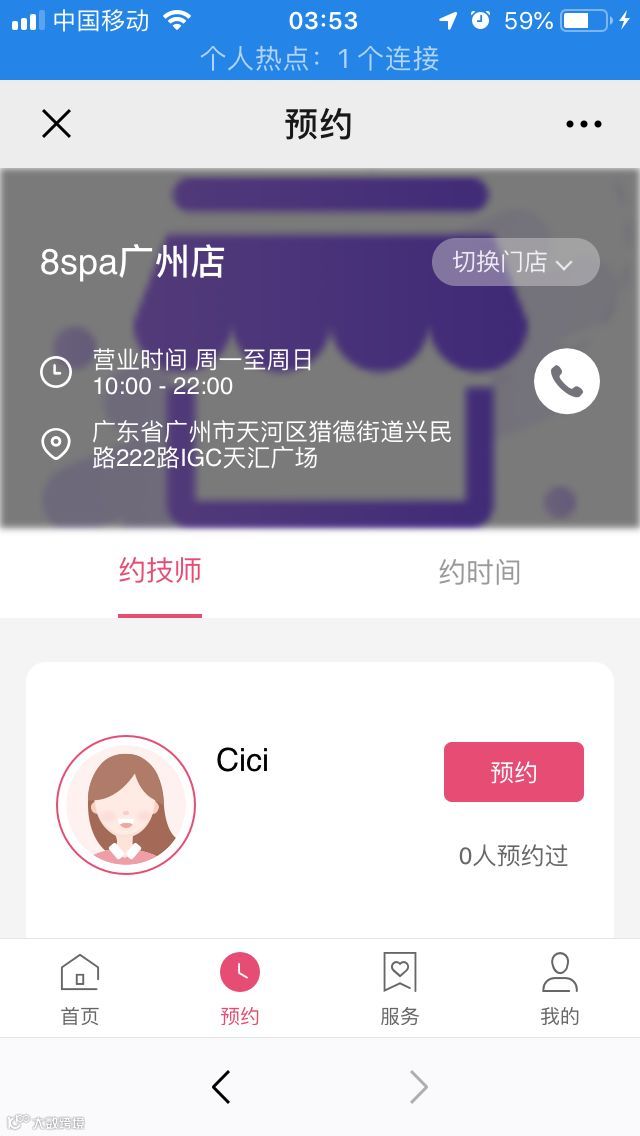 1. 预约管理¹。将成都、广州两家线下门店设为预约点,开放周一到周天 10:00~22:00 都可进行预约,方便两地客户在线上自行预约。在客流量大的时候,也有利于门店合理安排技师时间,提高店务管理效率。