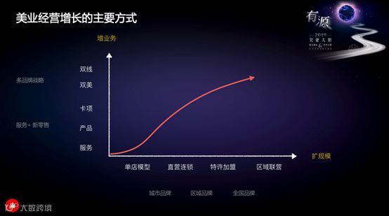 美业连锁机构的增长模式,主要是两个方向发展:一个是增业务,比如做多品牌,生美+医美的双美战略;高端品牌+年轻化品牌的多品牌经营;专业线+日化线的双线运营,以及一些机构探索的服务+新零售模式;另一个是扩规模,不断开店增加消费者覆盖面,不管是直营、加盟还是联营模式,连锁化运营都是美业机构的主要增长模式。