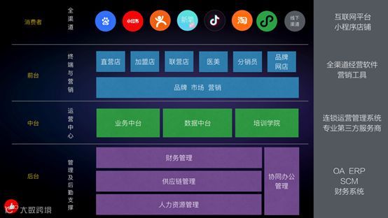 那是不是大企业才该思考中台?我认为品牌连锁机构也需要,因为中台不是一个标准解决方案、一套软件系统、一次组织结构调整,它是我们在发展中思考如何突破业务和组织瓶颈的方法。你业务所处的阶段,是应该构建“数据中台”积累和利用数据去支撑经营呢?还是应该成立一所培训学校,解决门店人才瓶颈的问题?还是需要一套数字化运营系统,让连锁总部能在营销上、管理上真正赋能门店?没有标准答案,只有经营者自己才明白该不该做出些改变。