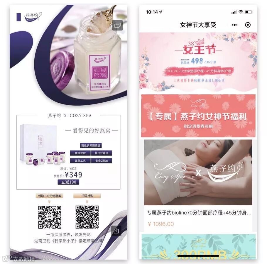 对于蔻舍cozy spa而言从线下实体经营,到线上营销拓客,找到一个四两拨千斤的获客方式更为重要。借力三八女神节小程序在线预约商城上线的同时,与知名燕窝品牌【燕子约】进行了一场线上与线下的异业资源互换合作。