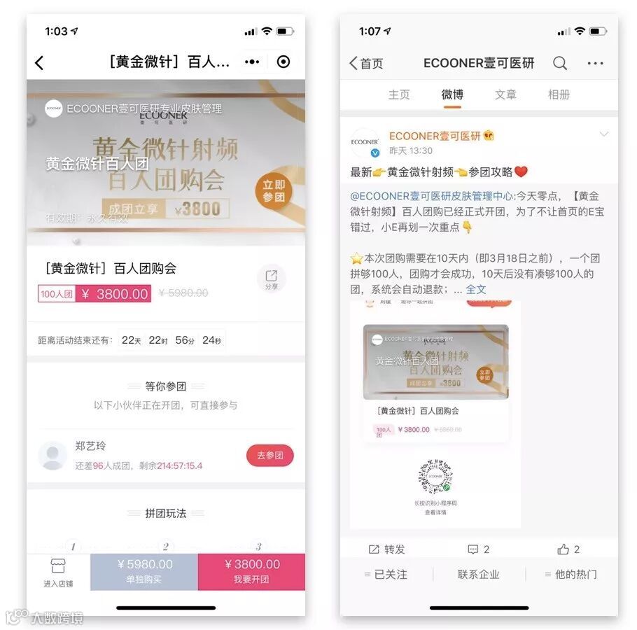 凭借口碑+拼团,壹可医研在微博公众号号召粉丝进行百人团,通过具有号召力的项目黄金微针刺激消费者!活动当晚1小时就完成100人团,交易额轻松过万。