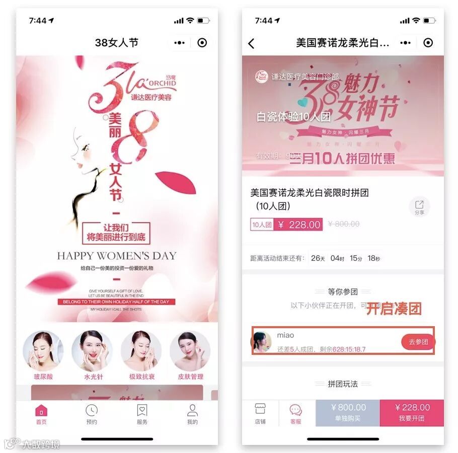 会员在精不在多,利用好现有的老客群体可以实现精准的老带新,新客转化成功几率也会大很多,借力三八女神节小程序拼团功能,结合老客微信群,到店更有额外奖励,线上线下同步进行,提升老客活跃度的同时也拓展了很多精准新客。