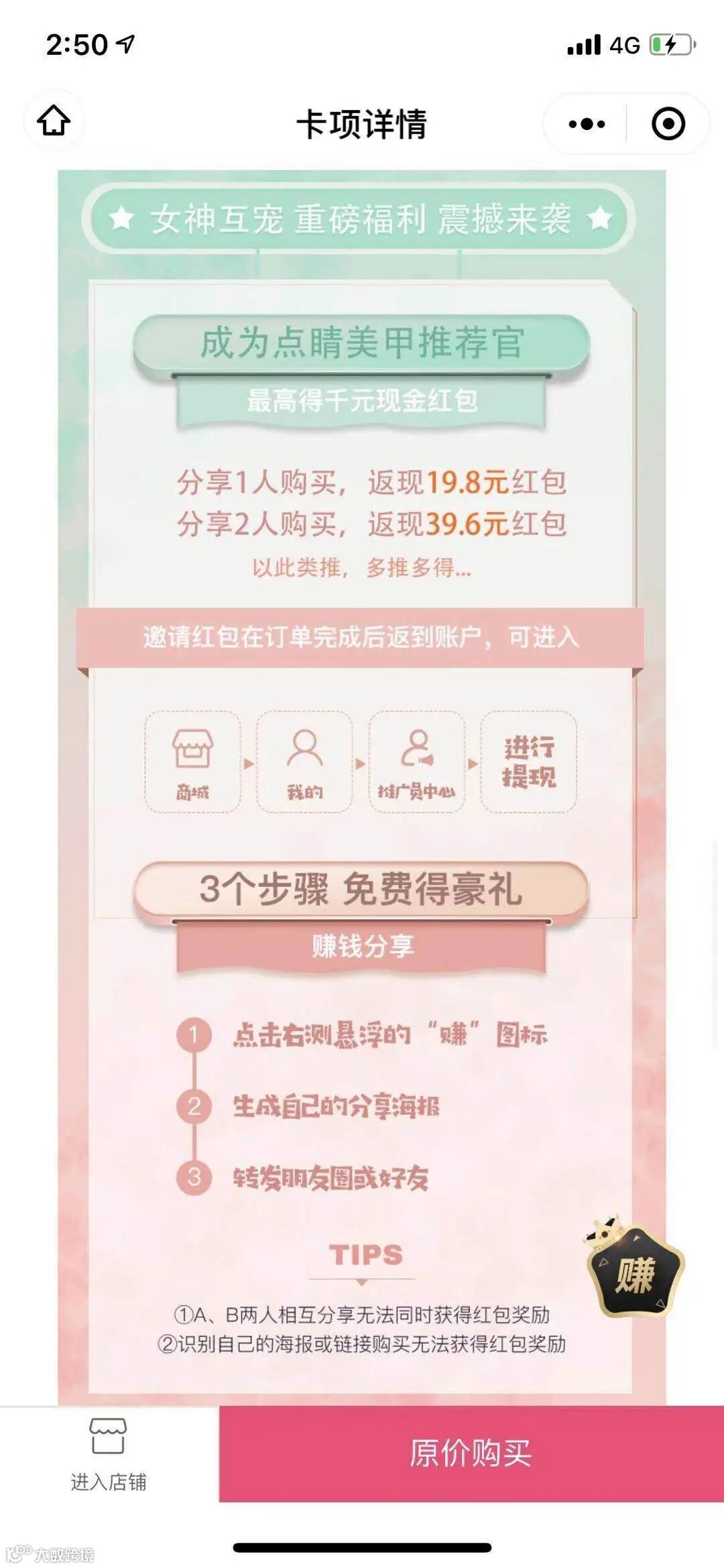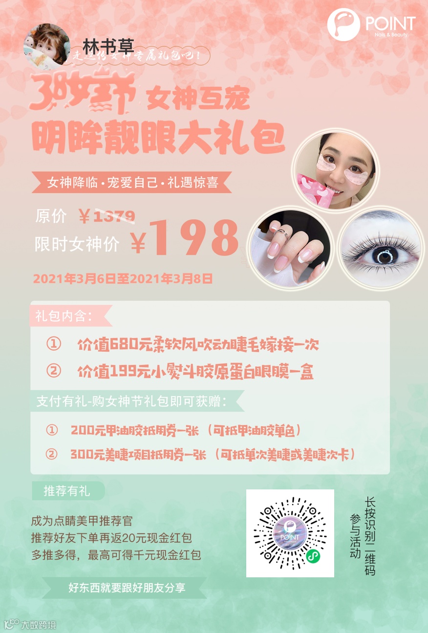 【营销策略】:借势38女神节日营销,推出198元美甲套餐活动。突出成为推荐官分享1位好友下单直返19.8元现金奖励的利益点,吸引社群、公众号的高粘性会员成为这次裂变种子用户,将活动海报转发至好友,引导更多客户进群下单。