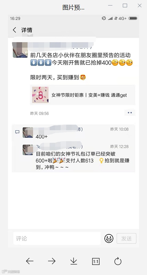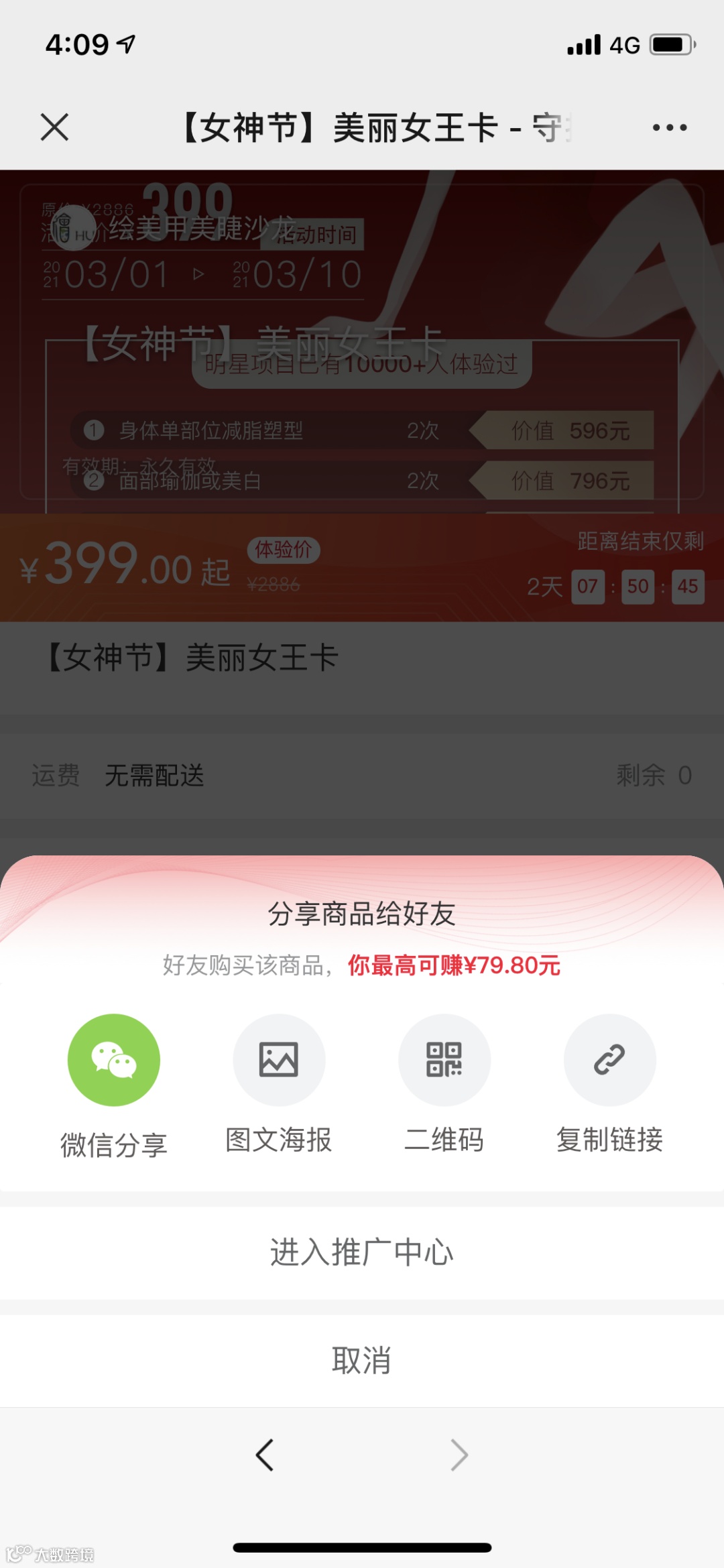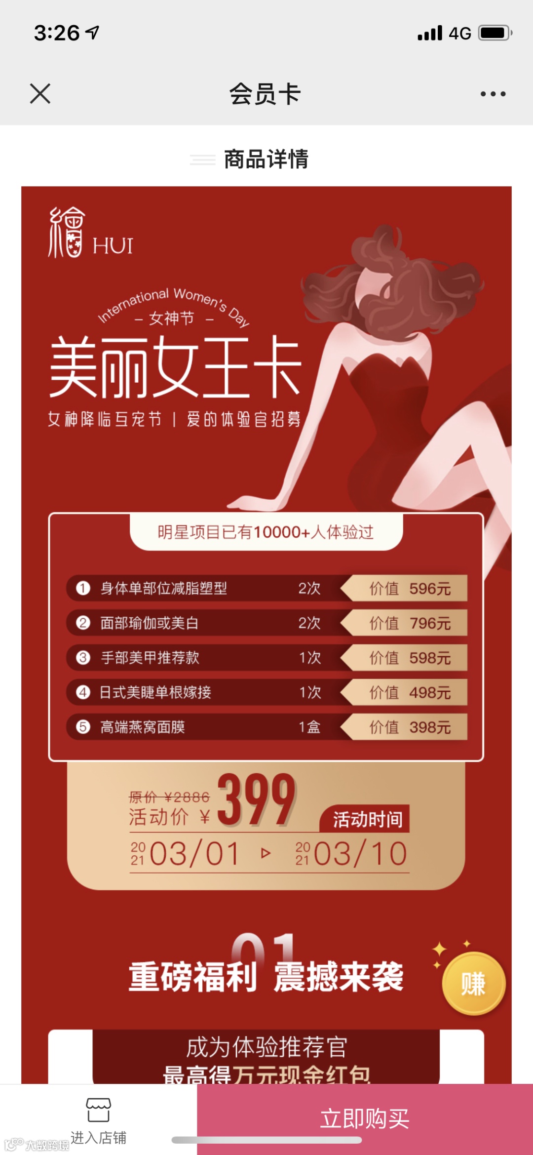 【营销策略】:借势38女神节日营销,推出399元女王卡体验官招募活动,突出成为推荐官好友下单直返80元现金奖励的利益点,员工将活动海报转发朋友圈和客户,吸引高粘性会员成为这次裂变种子用户。
