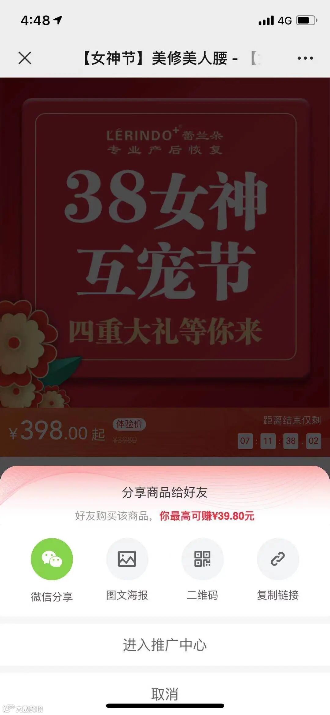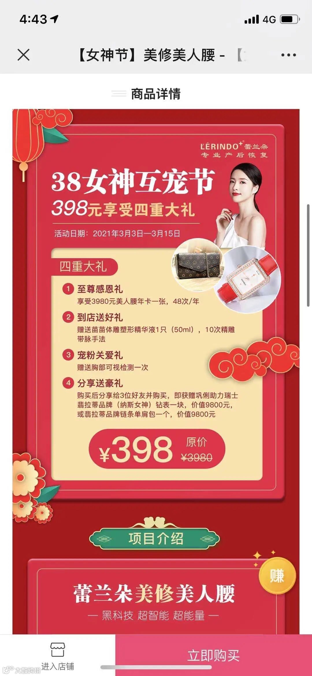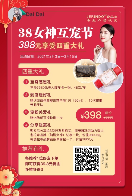 【营销策略】:借势38女神节日营销,推出398元享4重大礼活动,成为推荐官分享好友下单,突出1折优惠、分享3位好友下单得名牌手表、单笔直返39.8元现金奖励的利益点,员工将活动海报转发朋友圈和客户,吸引高粘性会员成为这次裂变种子用户。